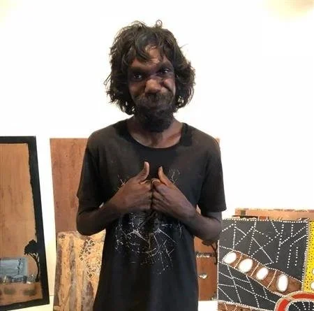 Fabian is the most well known of the Nyinkka men’s art collective - The Tennant Creek Brio. Fabian’s artistic output is prolific, highly imaginative and powerful. His graphic line work has a residual immediacy and conjures a concoction of mythological figures and motifs referencing various characters from the Old Testament, the Dreaming, Greek mythology, mythological beings and beasts. The works emanate a palpable raw energy and at their best contain the prophetic resonance of oracles