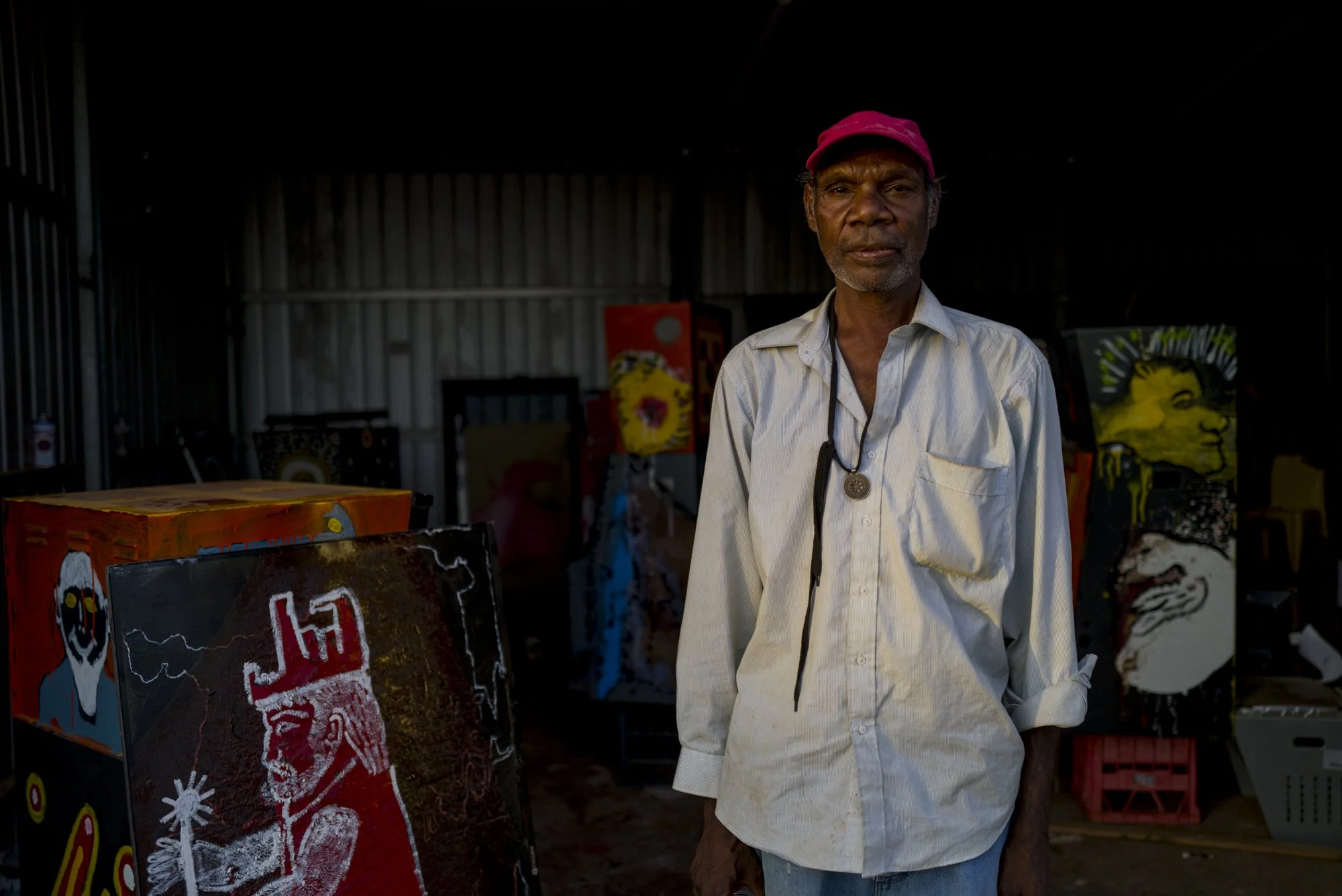 Many Brio works explore the psychological, historical and contemporary forces that shape the lives and identities of Aboriginal men living in Tennant Creek. Other works unfold as rich narrative worlds — painterly explorations of creation, spirituality, struggle and catharsis. The resulting artworks are raw, expressive and deeply layered, combining humour, symbolism and cultural knowledge with a fearless experimental spirit.