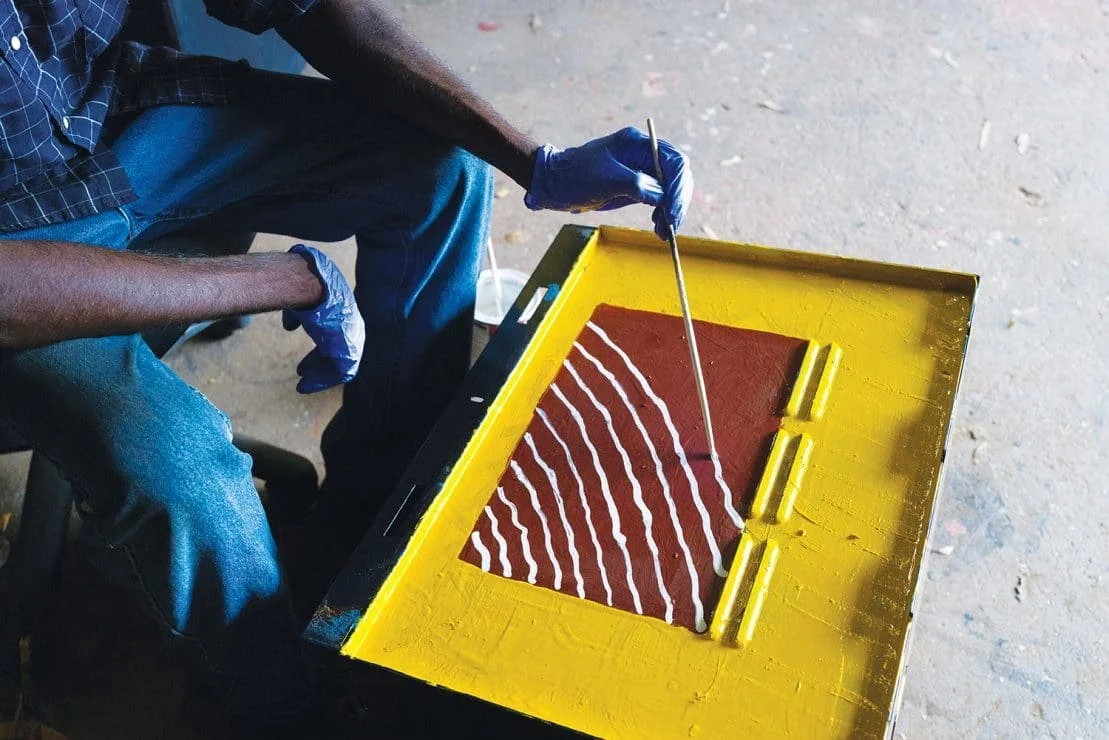 The group began in 2016 as an art therapy and outreach initiative established by Anyinginyi Health Aboriginal Corporation, bringing together a group of Aboriginal men from across the Tennant Creek community. The participants — a mix of cultural leaders, artists and men from the town camps — began meeting regularly to paint, share stories and explore creative expression. Over time, the group evolved into a powerful collaborative collective known as the Tennant Creek Brio.